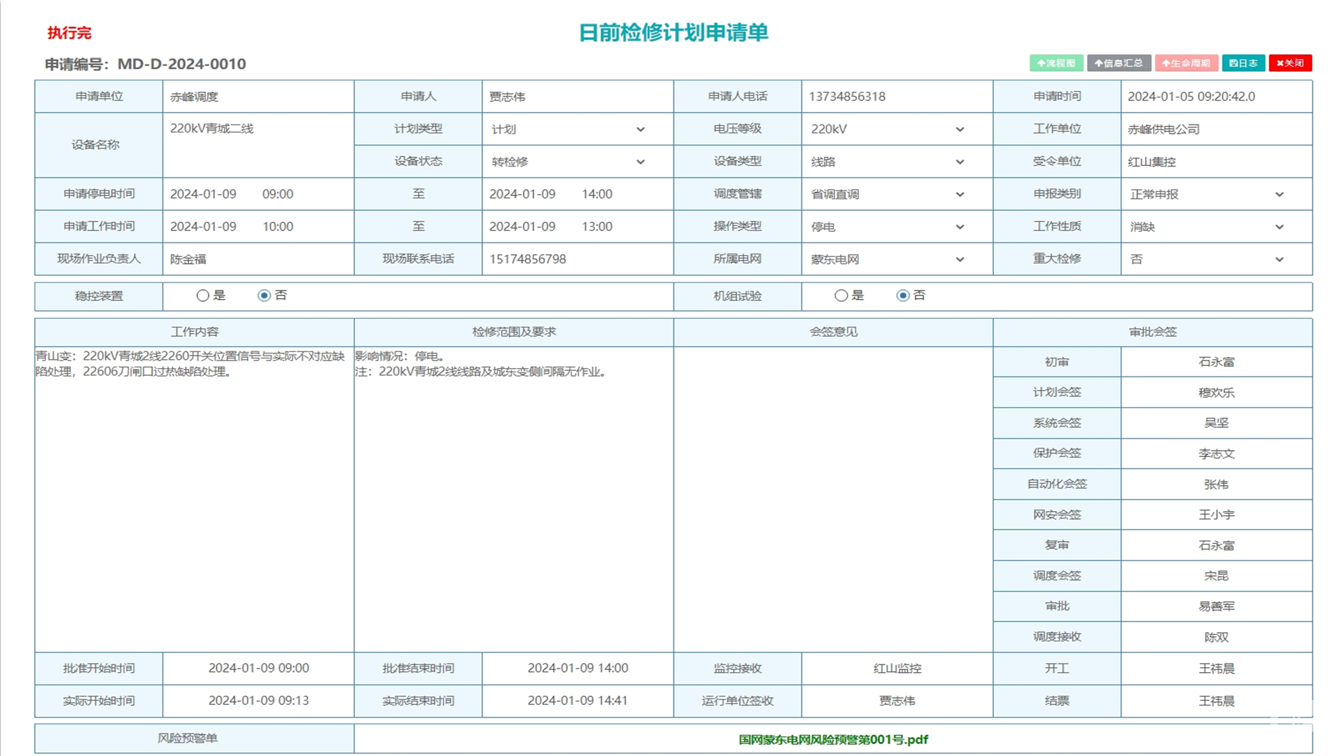 支持停电检修计划申请单从提交-会签-审批-发布-执行的整套流程管理,也可变通实现紧急停电计划从提交-执行的特殊化处理。
