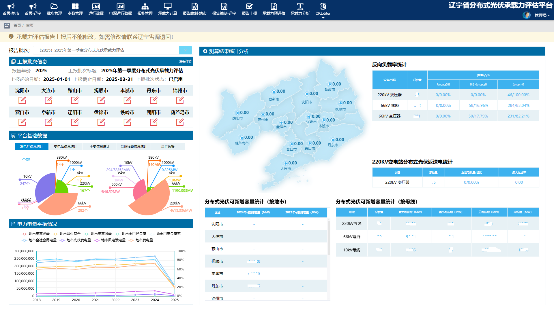 通过建设承载力平台,收集分布式光伏接入电网承载力评估边界条件,整理各区县相关设备参数数据并进行热稳定计算分析,得出各变电站可接纳分布式电源容量,通过短路电流、电压偏差及区域谐波的校核,确定各区县可独立新装分布式光伏的容量,画出相关拓扑图,形成辽宁省分布式光伏承载力评估报告,推动政府建立以电网承载力指标管控分布式光伏规模布局的工作机制,引导分布式光伏均衡有序发展。