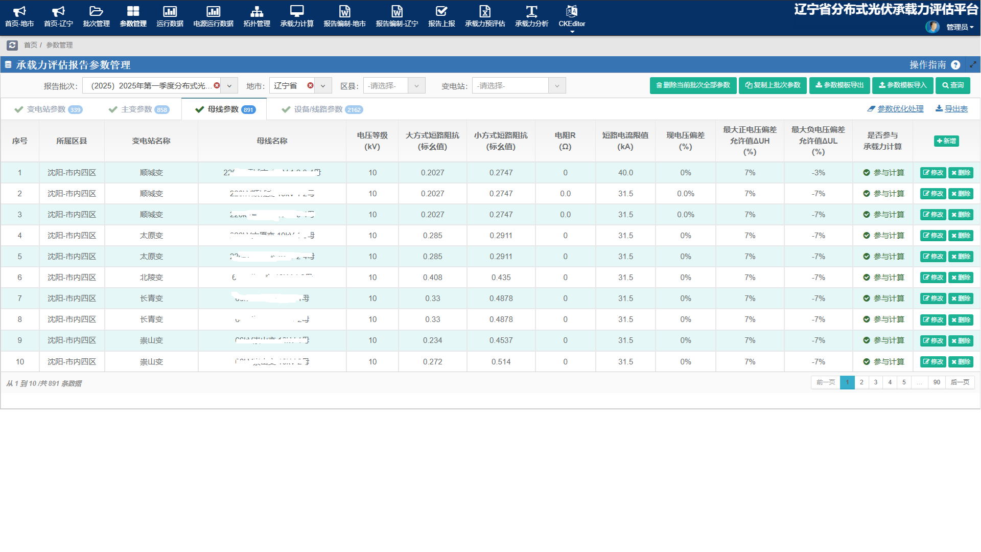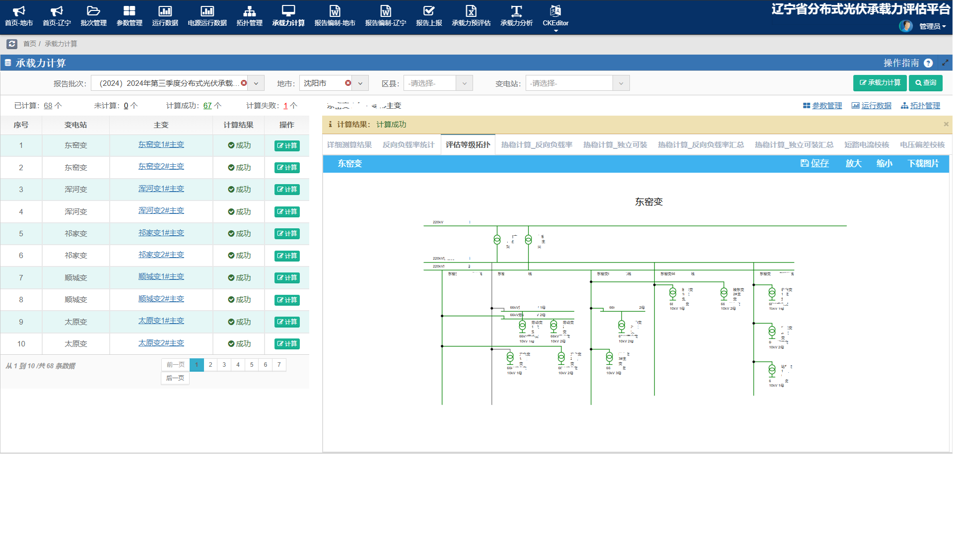 系统支持任意时间范围的计算,根据需求自定义计算批次,支持不同批次的横向对比分析。系统基于数据和拓扑关系快速计算各主变的方向负载率、独立可装容量、短路电流、电压偏差校核等数据。系统根据设备连接关系自动绘制拓扑,并支持拓扑在线调整。根据计算结果对拓扑进行着色处理。系统根据计算结果自动生成14个地市的承载力分析报告,并汇总省公司年度承载力报告。