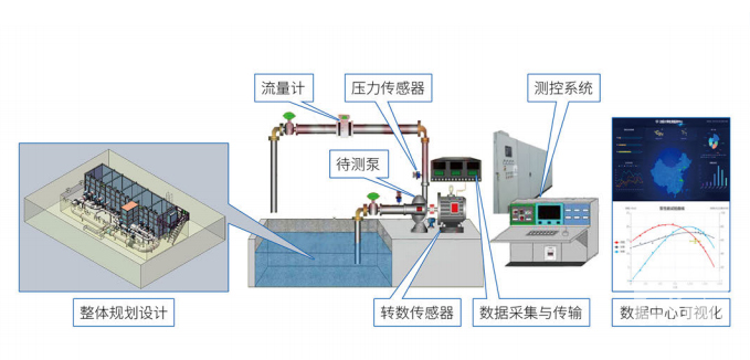 物联网体系下,建立分级管理模式,建立层级大数据中心,待测试泵的水参数、电参数等通过自研的数据采集模块,以有线或无线传输的方式上传至数据中心,顶层数据中心实现数据数据中心可视化、设备远程监控等,从而实现设备互联,数据共享。