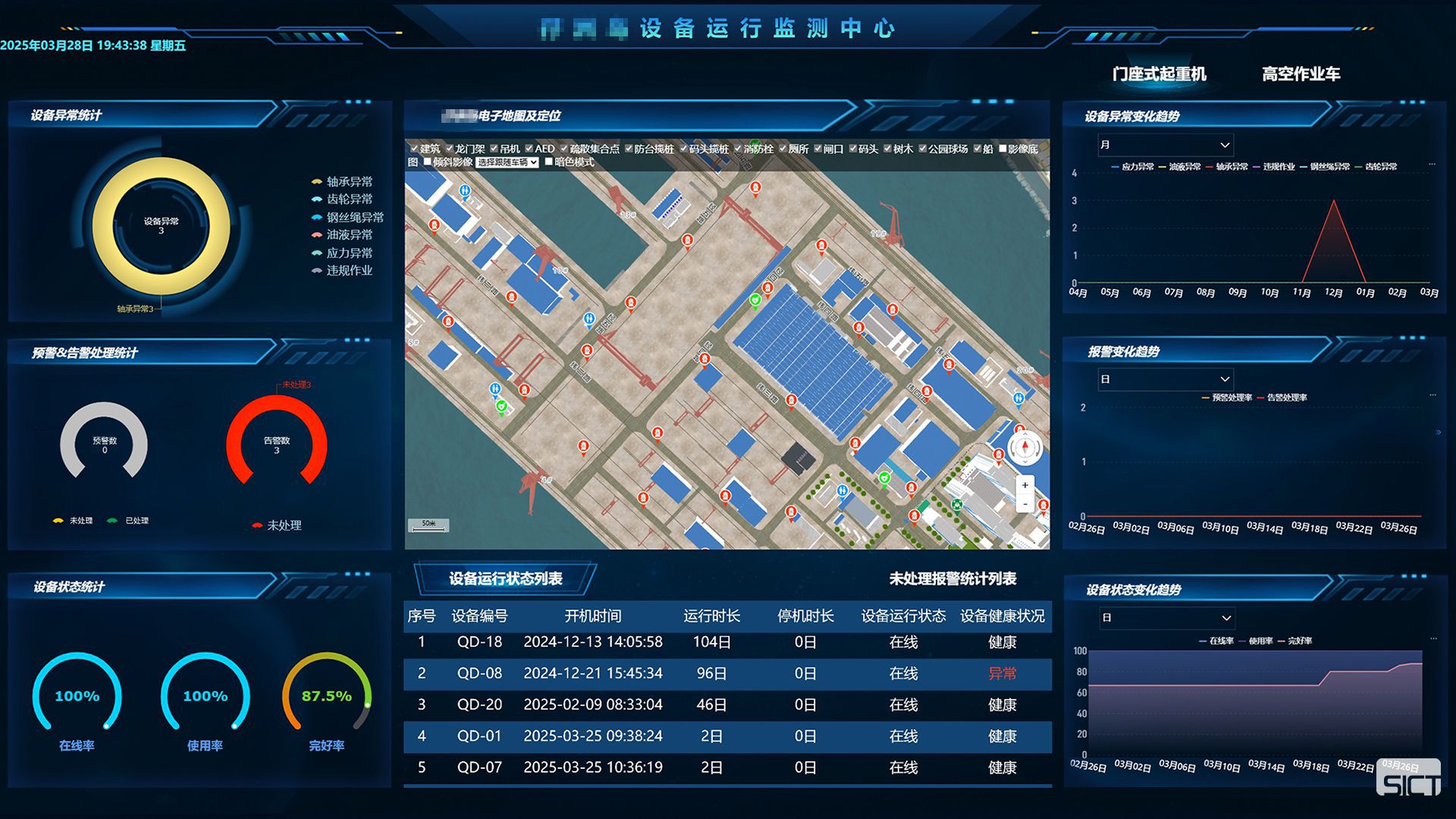 面向船舶制造关键装备打造的网络化、智能化的运行状态监测与故障诊断一体化平台。能够对门座吊机、高空作业车等核心设备的温度、振动、应力、倾斜等运行参数实时采集,结合多源传感器融合、远程通信和智能诊断算法,实现对设备状态的全面感知与潜在异常的精准识别。同时,通过可视化手段,直观呈现设备运行状况和风险预警,并与运维流程深度联动,形成监测、预警、决策与执行的闭环管理,有效提升制造装备的运维效率,全面增强船舶制造过程的安全性、稳定性与管理水平。