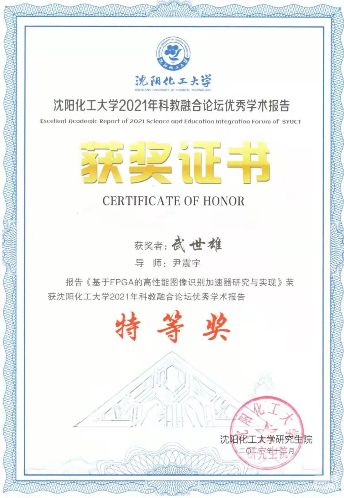 12月3日,沈阳化工大学举行研究生教育会议,会议宣读了2021年科教融合论坛研究生优秀学术报告获奖名单,沈阳计算与沈阳化工大学联合培养研究生武世雄的报告“基于FPGA的高性能图像识别加速器研究与实现”(导师:尹震宇)从各学院选拔的49名优秀研究生报告中脱颖而出,荣获特等奖。