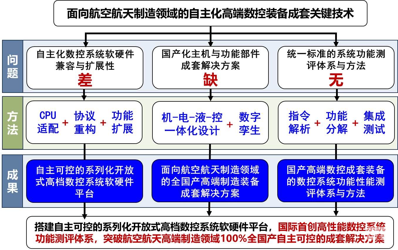 中科数控研发的兼容国产CPU的自主可控系列化高档数控系统,解决了高档数控系统及其核心芯片长期依赖进口、技术受制于人的问题,首次实现全国产配套的高端机床装备在航空航天领域应用,并实现加工过程的数字孪生与全程监控,满足飞机和航空发动机复杂零件加工需求; “高性能数控系统功能测评体系”和“‘功能分解-集成测试-两户评估’ 功能测评方法”为国内外首创,解决了高性能数控系统功能测试“无法可依、无标可循” 的现状。该成果技术难度大、创新性强、填补了国内空白,提升了我国在航空航天领域的自主可控制造能力和国防安全保障水平,整体技术达到国际先进水平。