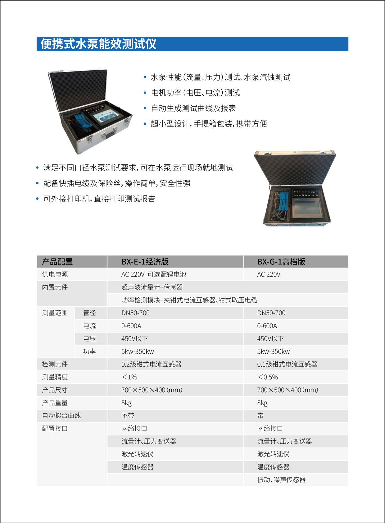 2.便携式水泵能效测试仪:拉杆箱式外观设计,可对电流、电压、流量、压力等参数快速采集,产品轻便,操作简单,无需安装,即插即测。