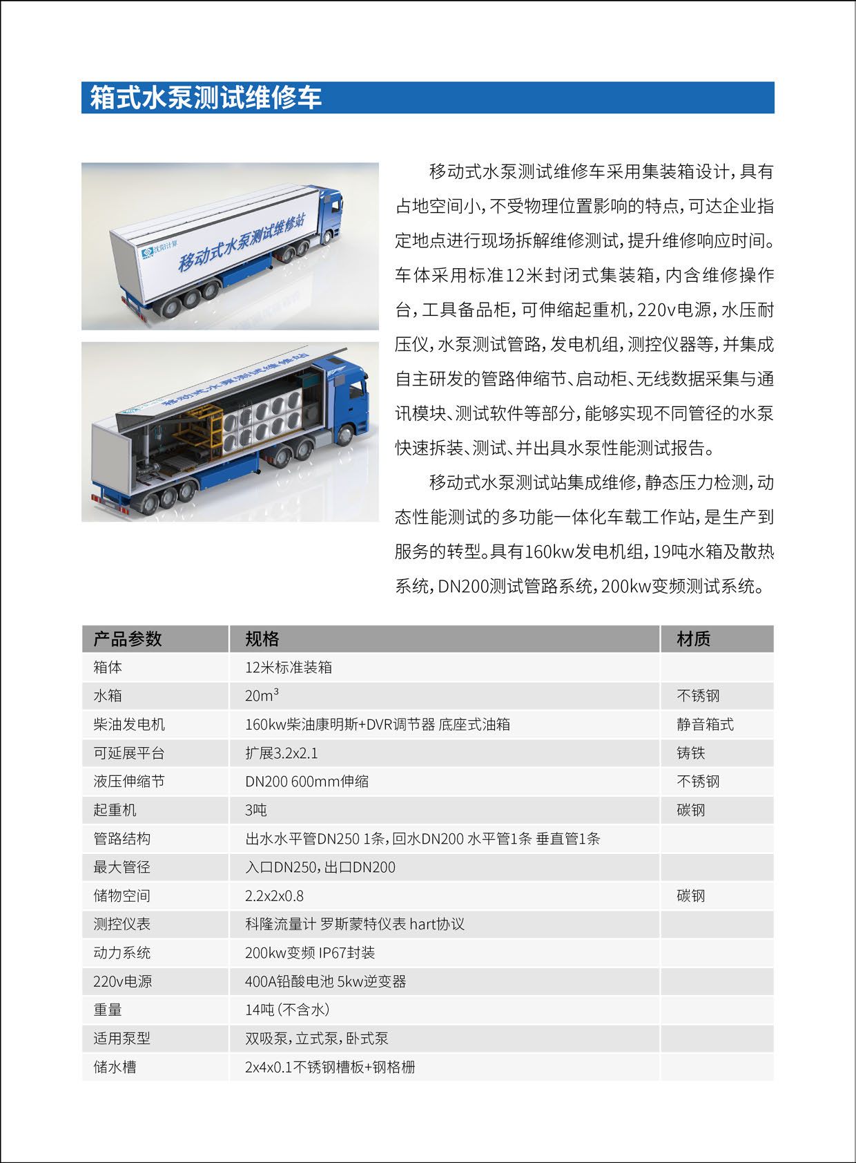 1.集装箱式移动测试车:集成了测试、维修的整套系统,包括水箱、管路、流量计、压力计、测控系统,实现现场测试及维修。
